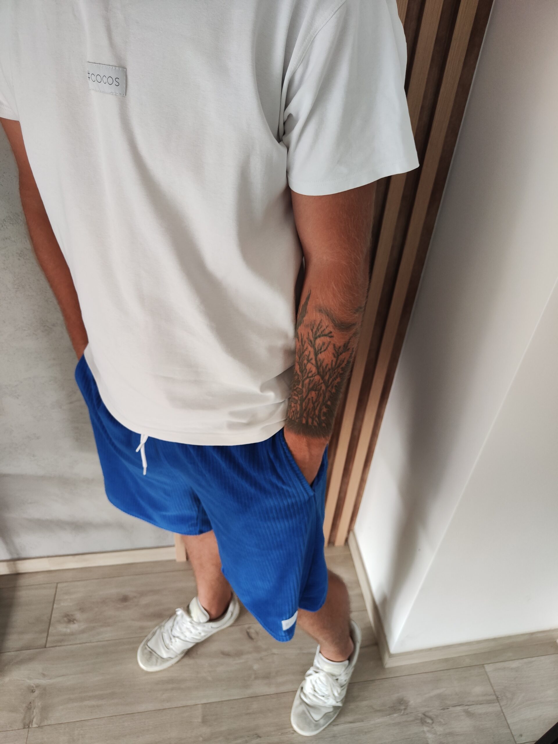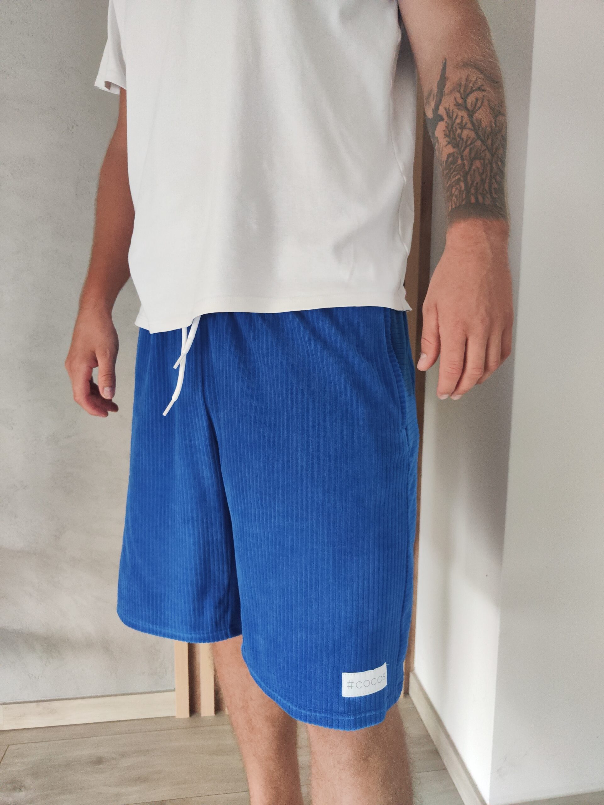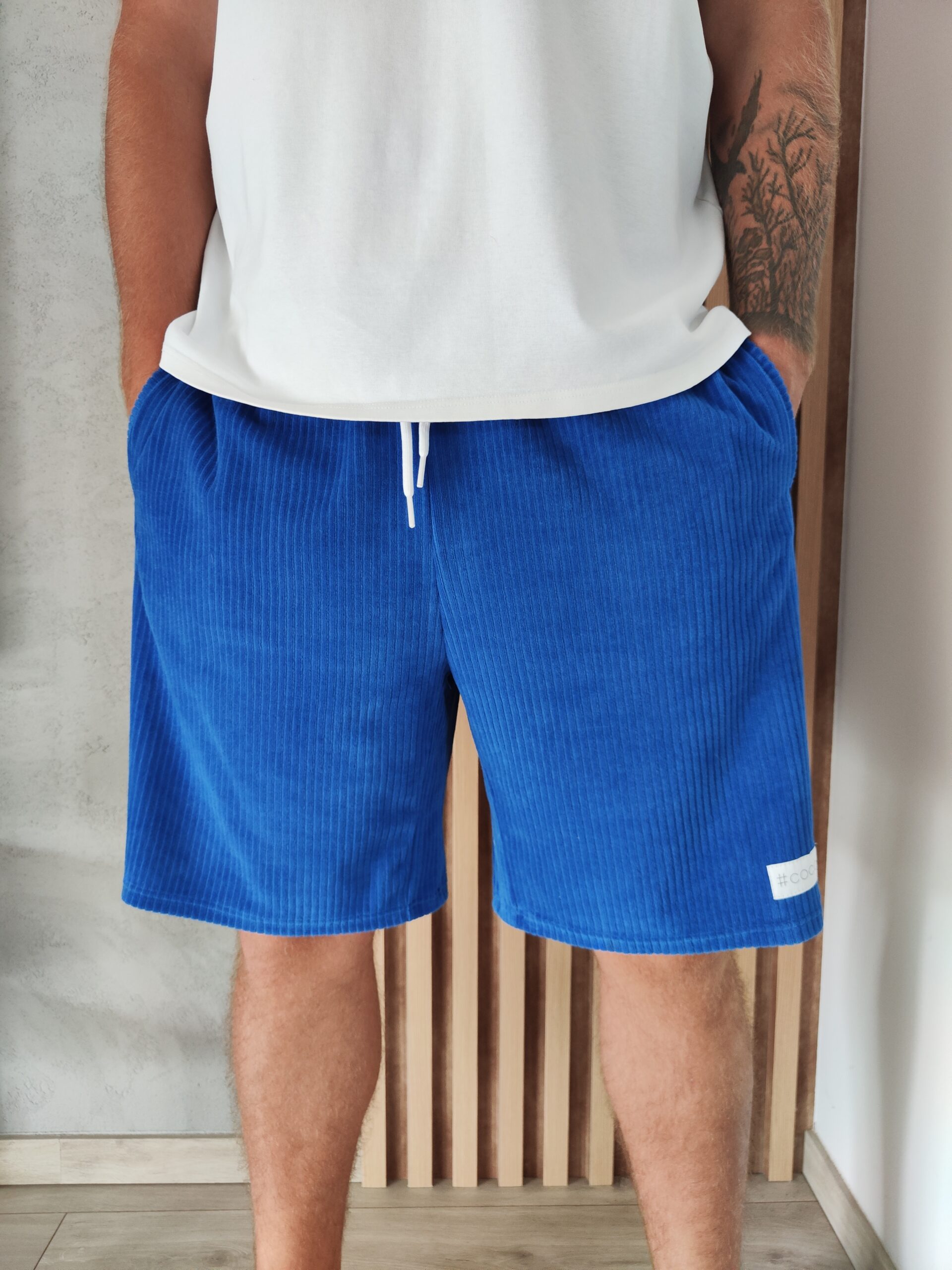 Kobaltowe szorty męskie z weluru o fakturze sztrusku. Komfortowy, szeroki krój zapewnia swobodę ruchów i styl. Idealne na letnie dni!